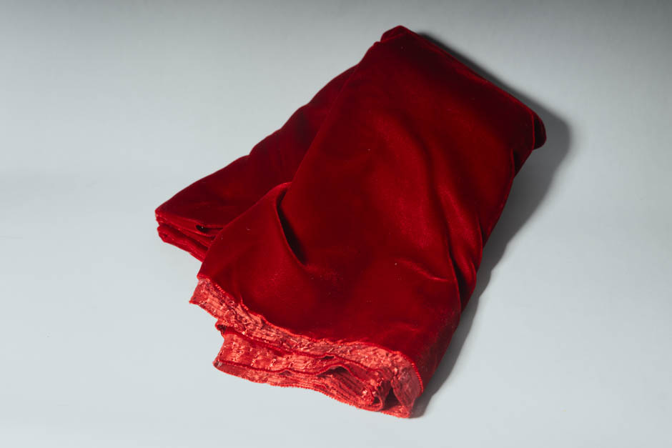 Rich velvet with golden studs along the edges. Similar collars found in Henry VIII’s inventory, though the design can be found in 1400s as well. Martingale style.