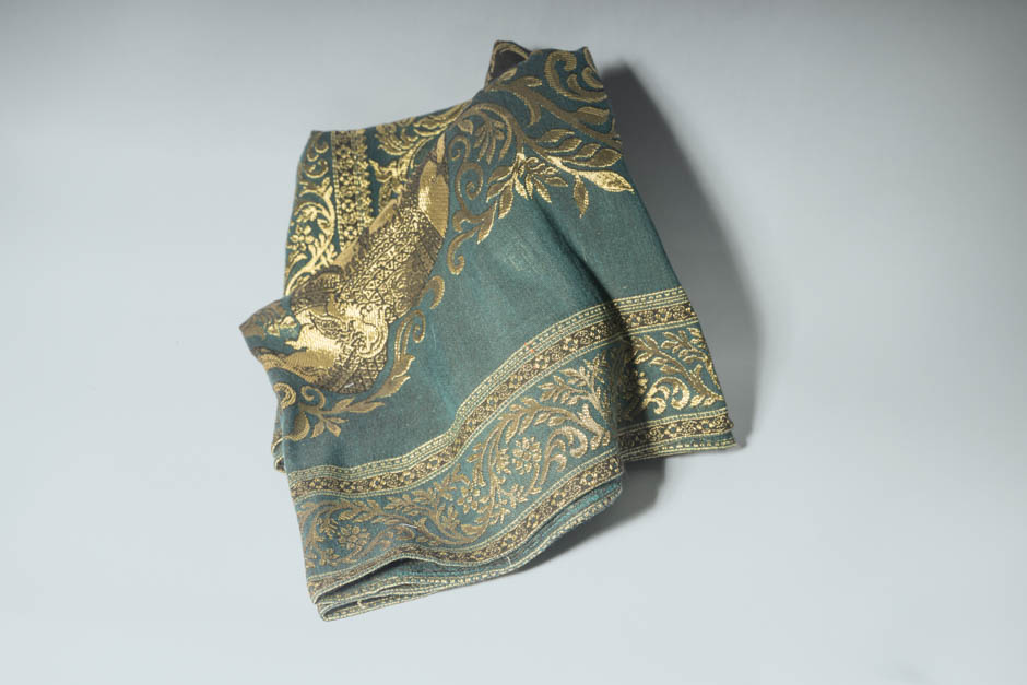 Ercules is a woven tapestry of gold on a background of rich teal. The middle of this material features a golden elephan!
